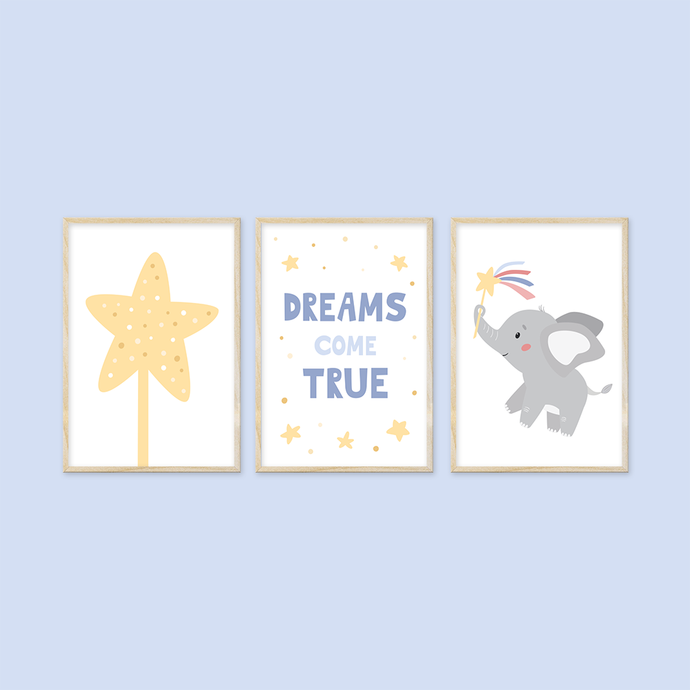 Bebek ve Çocuk Odası İçin Fil ve Yıldız Temalı 3'lü Tablo Seti