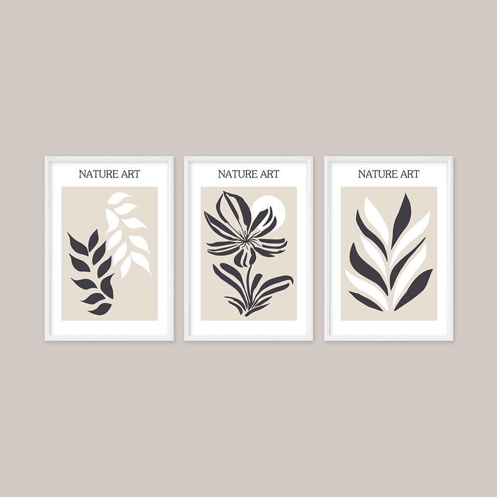 Bej ve Nötr Tonlarda Çiçek ve Yaprak Temalı 3'lü Tablo Seti (TSET0187)