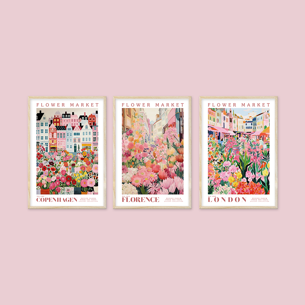Copenhagen - London - Florence Flower Market 3'lü Tablo Seti (TSET0183)