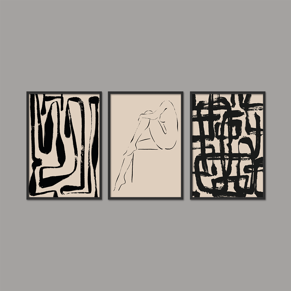 Soyut şekiller ve kadın çizimi 3'lü Tablo Seti
